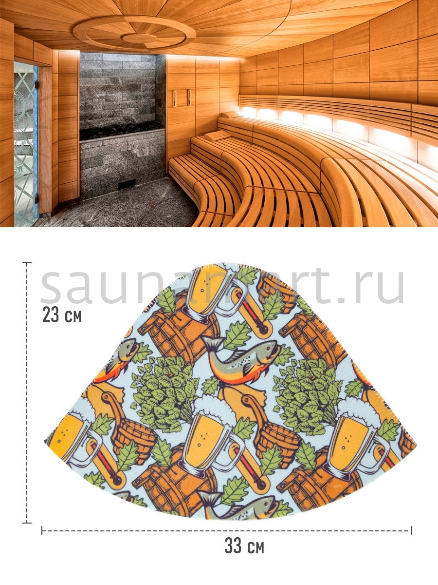 Шапка это необходимый атрибут для похода в баню или сауну. Высокая температура и сухой воздух в парной могут вызвать перегрев и ожоги кожи головы. Шапка для бани убережет голову, уши и волосы от высокой температуры и перегрева. Если пренебрегать защитой головы с помощью шапочки, то волосы теряют влагу и становятся ломкими и сухими. Помимо термоизоляционных свойств банная шапка обладает отличными гигроскопичными свойствами - прекрасно впитывает влагу и пот, что сделает Ваше пребывание в парной более комфортным. Головной убор для бани выполнен из натурального материала – войлок. Материал достаточно пористый, за счет чего создает своеобразный защитный барьер по принципу термоса, для изоляции от высокой температуры. Стильный, яркий, необычный рисунок выделит Вас и подчеркнет Вашу индивидуальность. После применения расправьте шапку и просушите. Размер универсальный. Мы предлагаем Вам не только эффективное средство защиты от перегрева, но и стильный яркий аксессуар для бани и сауны.