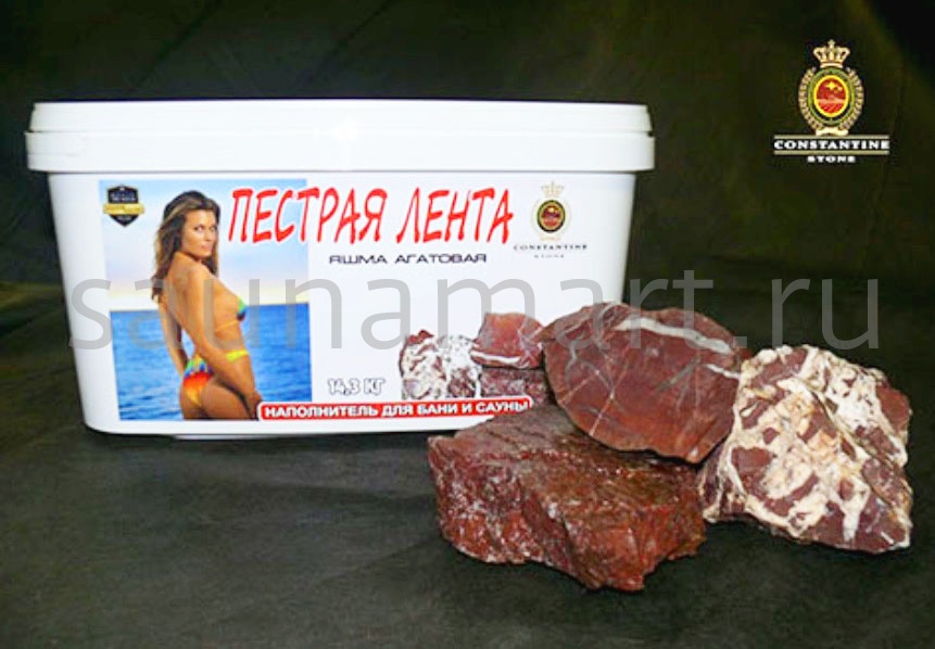 Камень для бани «ПЕСТРАЯ ЛЕНТА Яшма Агатовая» - это камень-наполнитель, представляющий собой произведенную по оригинальной технологии, обработанную, фракционированную и особым образом смешанную продукцию из натуральных горных пород для печей открытого горения, электропечей, газовых печей, парогенераторов. Используется в банях, саунах, турецких банях (хамам).