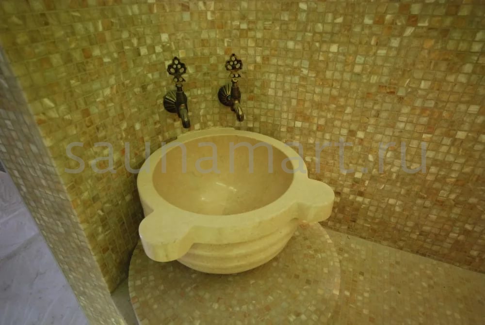 Курна – элемент интерьера турецкой бани, она используется для омовения. В курну без слива вода поступает напрямую из смесителя и изящно выливается через край. Мраморная чаша устойчива в условиях повышенной влажности, а это значит, что она прослужит Вам долгие годы. Курна Камнирус КМ10 имеет утончённую округлую форму и удобные выступы по краям. Она устанавливается вплотную к стене. Такая деталь сможет создать особую этническую обстановку и прекрасный микроклимат в Вашем хамаме.