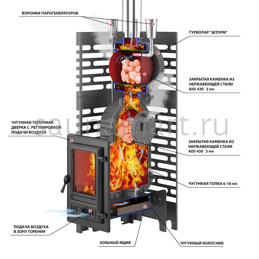 В каменку из нержавеющей стали укладывается до 20 кг камней, что позволяет создавать дополнительный тепловой и паровой контур. Как и в печи Астон Шторм, каменка с боков герметично закрывается крышками. В них размещены система подачи воды с воронкой и отверстие для выхода пара. Пар из каменки Турбопар Шторм так же выходит с характерным звуком.