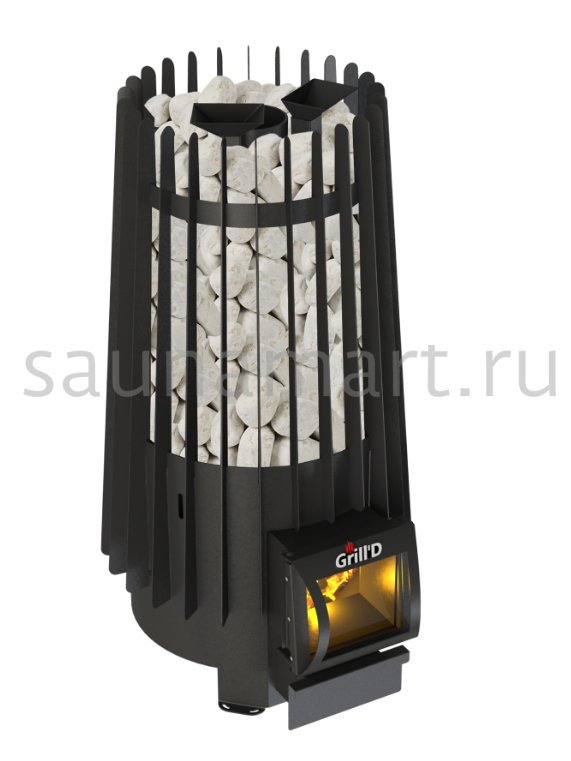 Печь топится из парильного помещения. Закрытая каменка вмещает 30 кг закладки камней. Температура в ней достигает 550 градусов. Две воронки для подачи воды размещены на разной высоте. Таким образом вы можете получить 3 вида пара от мелко дисперсного до видимого. Внутренняя каменка быстро восстанавливается, с такой печью можно проводить более 20 парений в день. В домашней бане эта модель порадует своих владельцев предсказуемостью и долгим сроком эксплуатации.