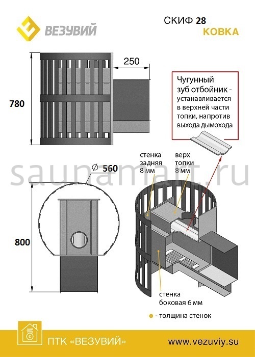 Стальная печь Везувий Скиф ковка 28 (205) отличает грамотно продуманная конструкция, сочетающая достоинства кирпичных и металлических банных отопителей. Для ее разработки изучались лучшие российские и зарубежные агрегаты. А изготавливают эту печку из специальной конструкционной стали, которая не подвергается деформации под воздействием высоких температур. Как любое металлическое отопительное устройство, Скиф быстро прогревает помещение, хорошо продуцирует пар, просто монтируется и обслуживается.