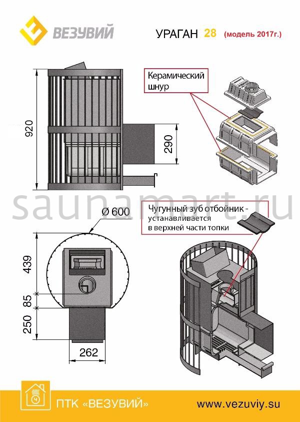 Преимущество печи серии УРАГАН в том, что она состоит из 3-х элементов. На стыке между ними используется керамический шнур с рабочей температурой 1200 градусов, что делает топку печи абсолютно герметичной. Для фиксации деталей между собой применяется болтовое соединение, что даёт 100% гарантию безопасности при эксплуатации. Банная чугунная печь Ураган Ковка 28 (224) укомплектована чугунной герметичной дверцей Везувий 224. Закрытая каменка изготовлена из стали и вмещает в себя не менее 60 кг камней. Конвекционно-вентилируемый кожух "Ковка" изготовлен из металлической текстурированной полосы, покрашенной термостойкой краской и покрытой патиной «Бронза».