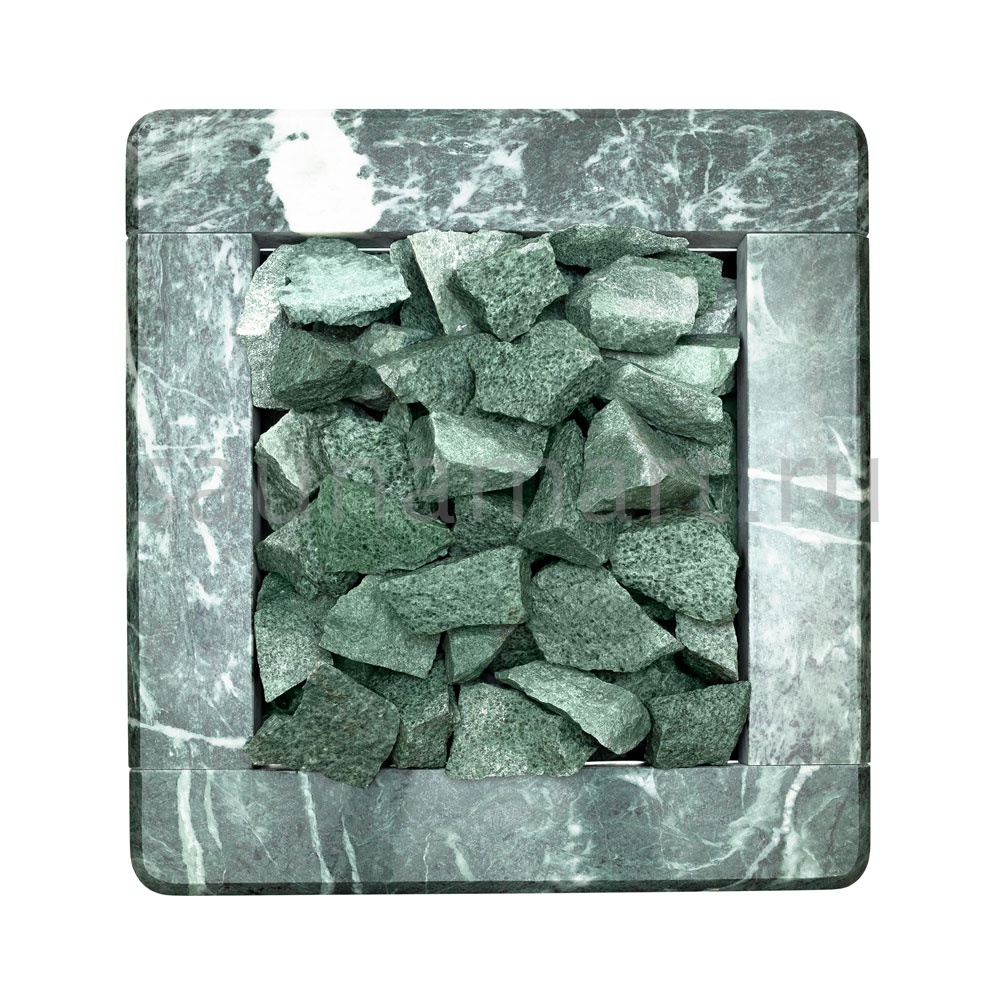 Электрическая каменка со всех сторон облицована натуральным змеевиком. Печь с подобным дизайном стильно смотрится в парильном помещении. Змеевик уже долгие годы используется для внутренней отделки бань. Его называют «аптекарским камнем» за его целебные качества. Минерал оказывает обеззараживающий эффект, положительно влияет на кости, оказывает успокаивающее воздействие и укрепляет иммунитет.